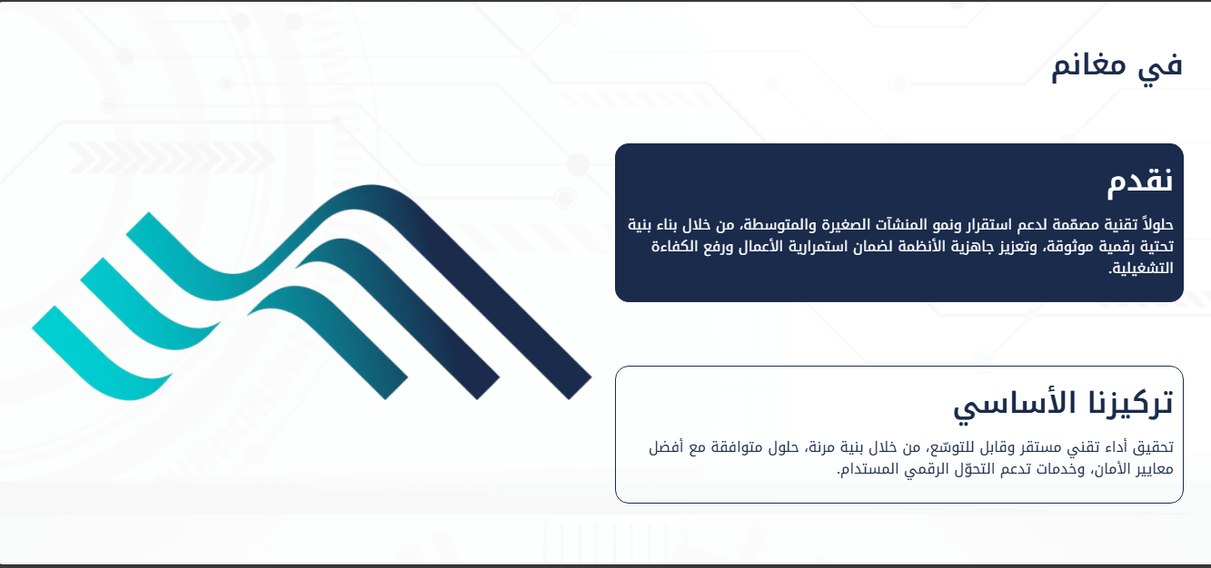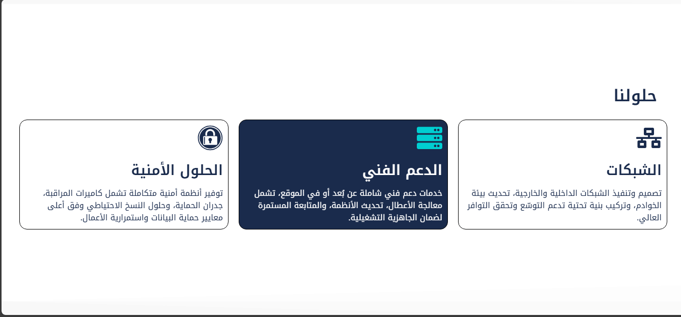 تم تصميم الموقع ليعكس طابع الشركة الاحترافي ويعرض خدماتها التقنية بشكل منظم وواضح، مع مراعاة تحسين السرعة، ودعم الأجهزة الذكية، وتكامل الهوية البصرية للشركة.